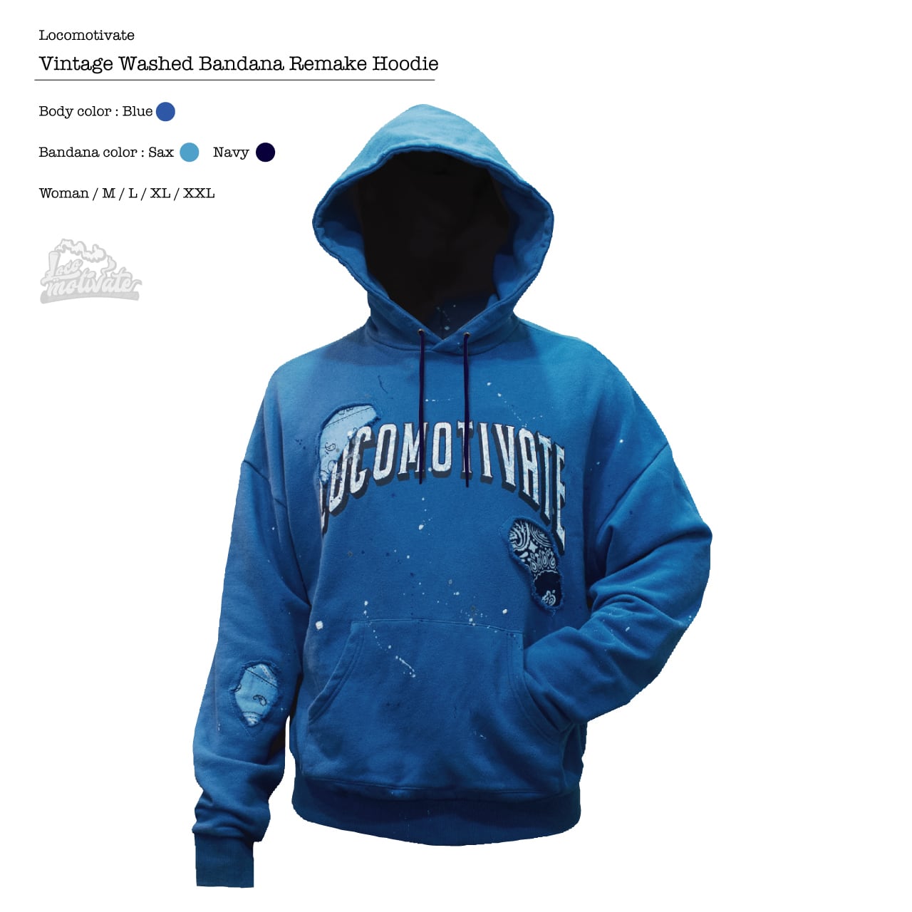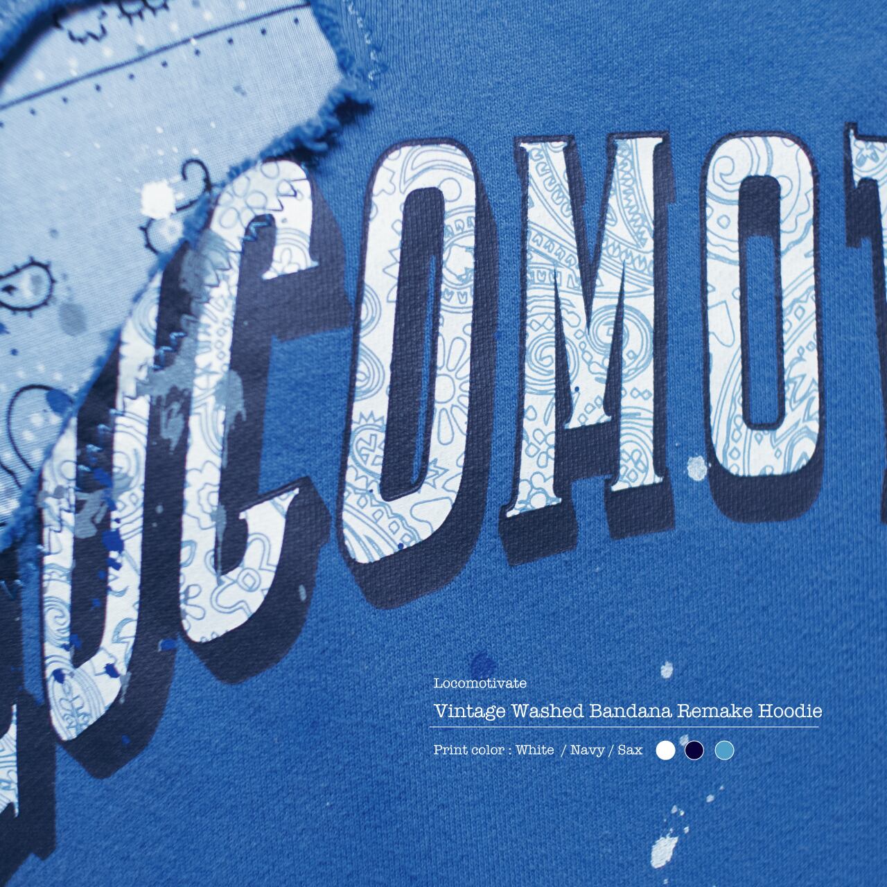 LOCOMOTIVATEのブランドネームがプリントされたバンダナリメイクフーディーです。