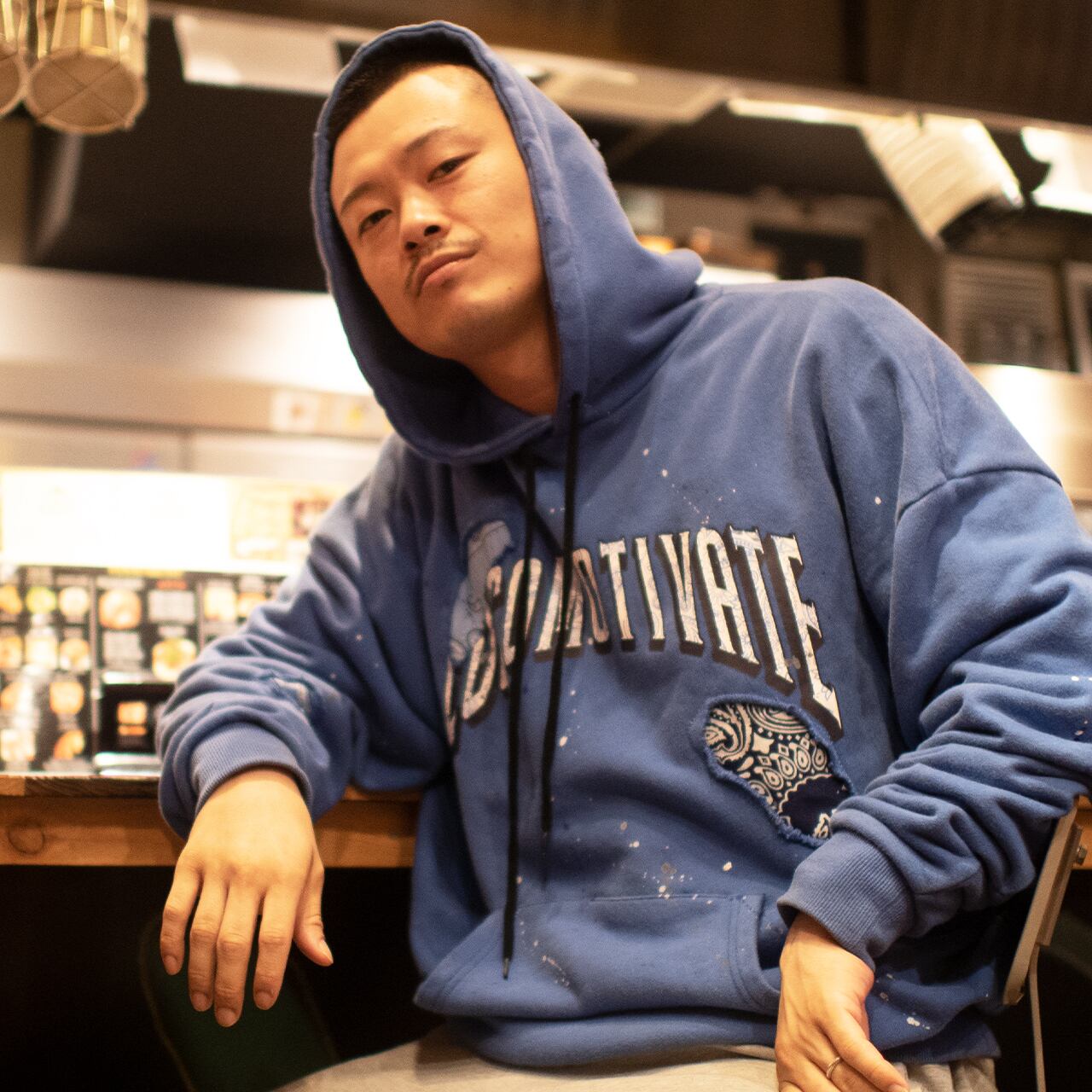 ヴィンテージウォッシュ加工された綿100%の裏毛のボディに、バンダナによるリペア加工とペンキ加工が施されています。